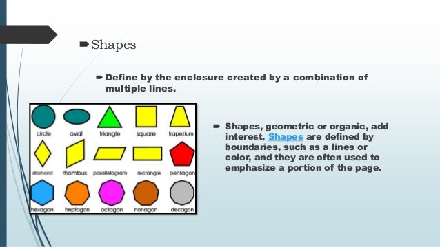 - 5. Shapes Define by the enclosure created by a combination of multiple lines. Shapes, geometric or organic, add interest. Shapes are defined by boundaries, such as a lines or color, and they are often used to emphasize a portion of the page.